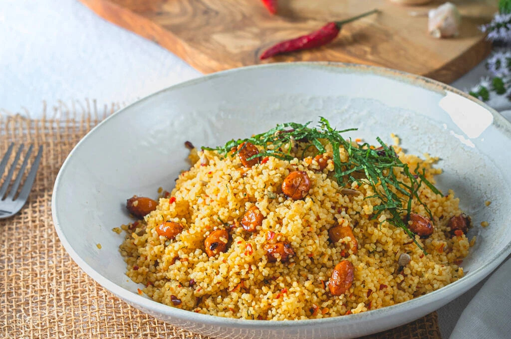 Cous-cous mediterráneo con virutas de delicias de cerdo al recuerdo de aromas árabes